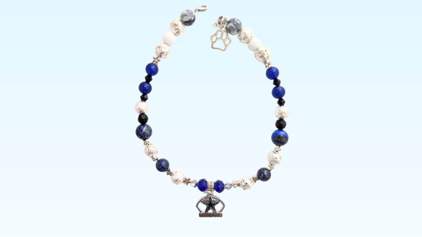 Show off your Dallas Cowboys pride with this handcrafted dog necklace, featuring Onyx beads, Silver Lava, and Blue Crystals for a luxurious, team-inspired look. Perfect for game day, it also supports animal rescues, making your purchase a win for both you and your furry friend!
