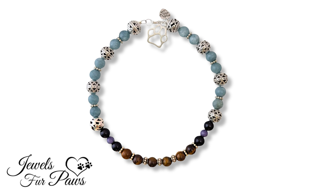 M 12″ Pet Chakra Necklace for Dogs & Cats – Aquamarine & Tiger Eye – Throat & Solar Plexus Healing