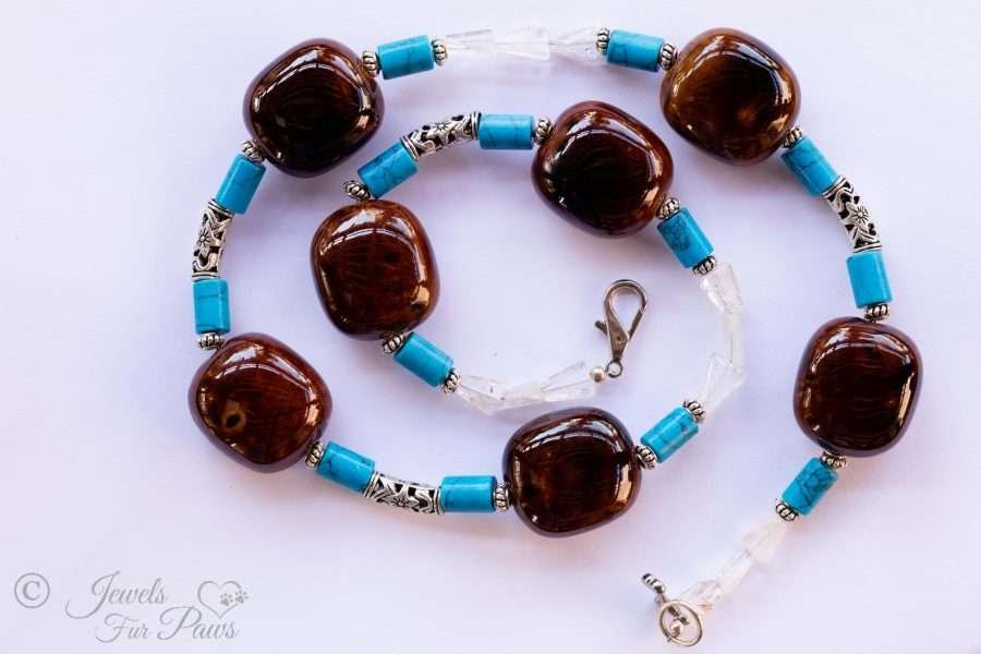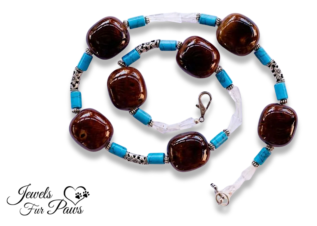 This hand strung necklace features seven large brown stones for your furry friend. Beautiful turquoise ovals complemented by emerald crystals tie this fetching piece together.