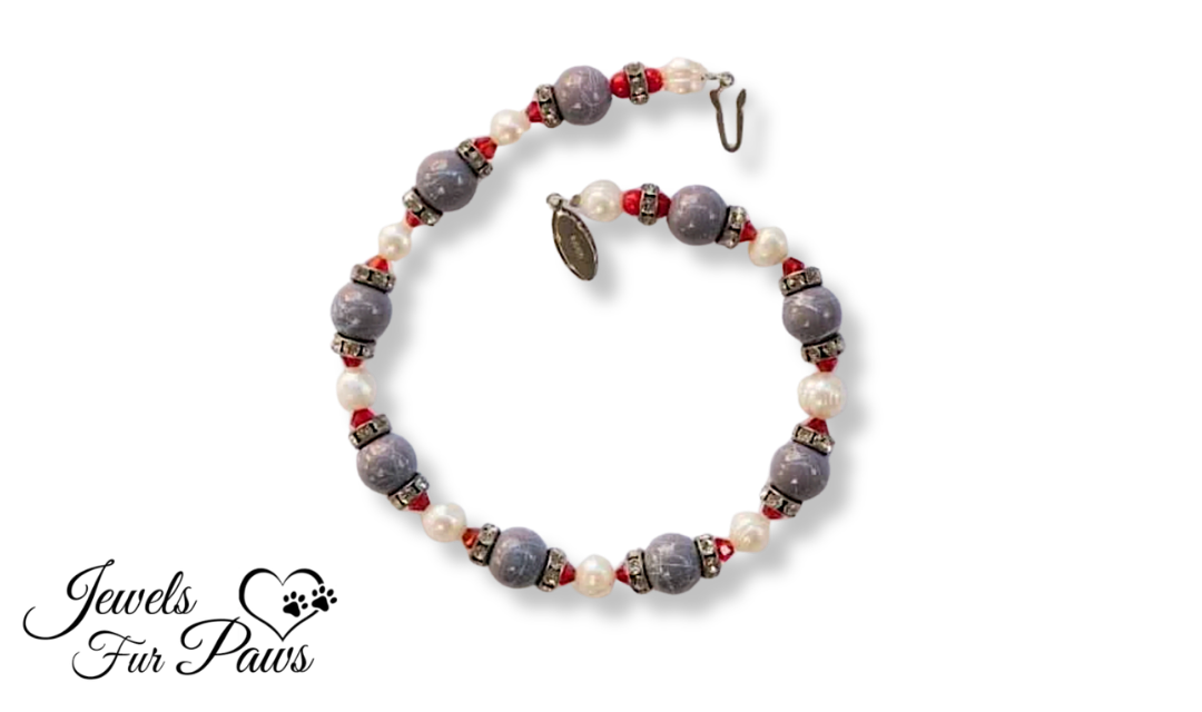 This handcrafted necklace features beautiful blue marbleized beads with cultured pearls, complemented by bright ruby red Czech crystals and silver channel set crystal separators.