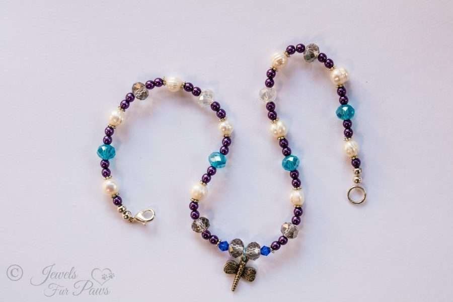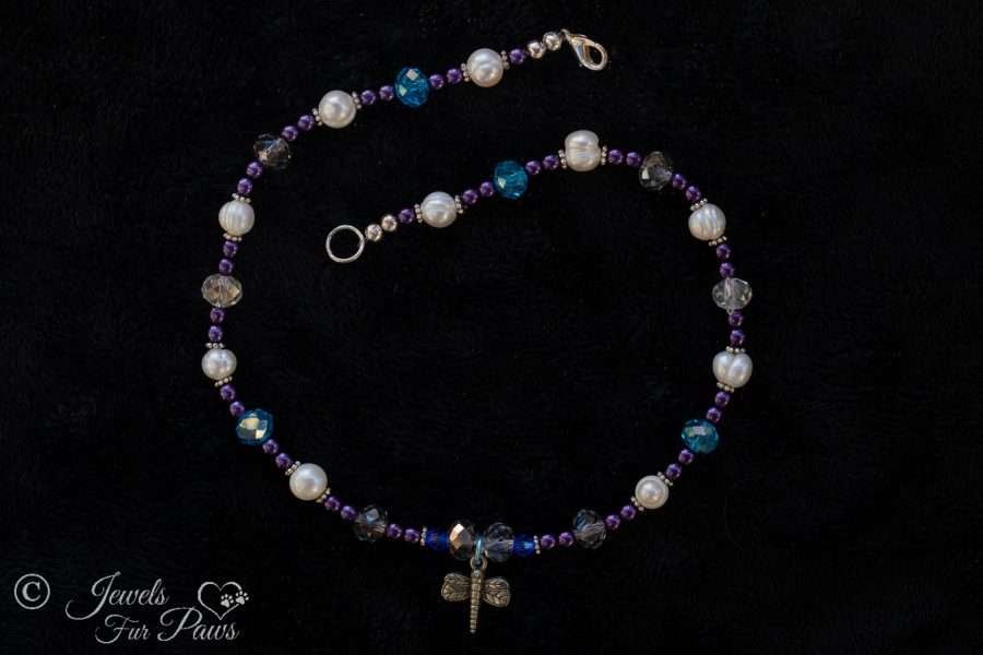 This purrty handcrafted necklace is a member of our dragonfly pendant series. It is strung with duos of purple beads and blue faceted Czech crystals, complemented by beautiful pearl beads.