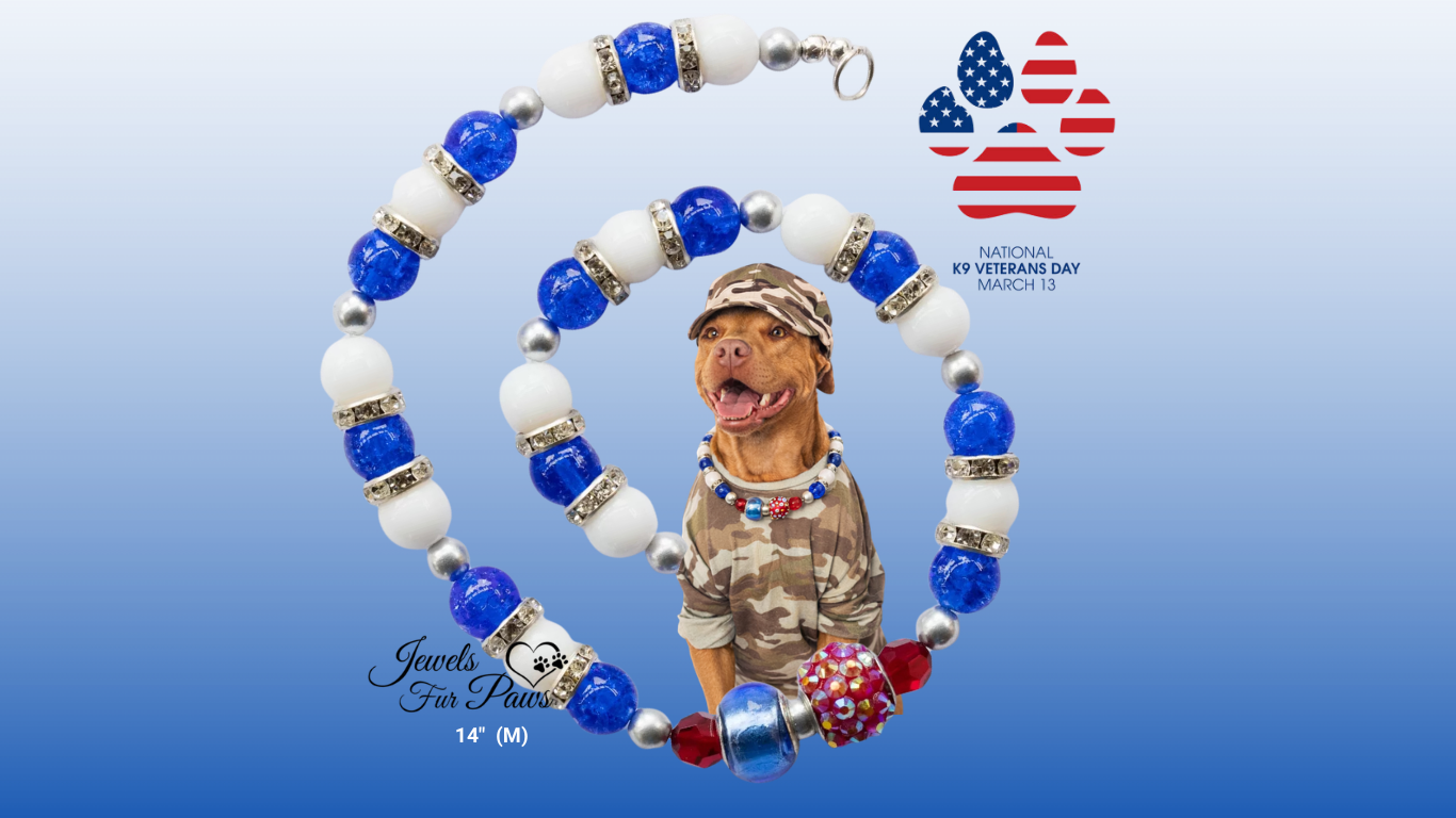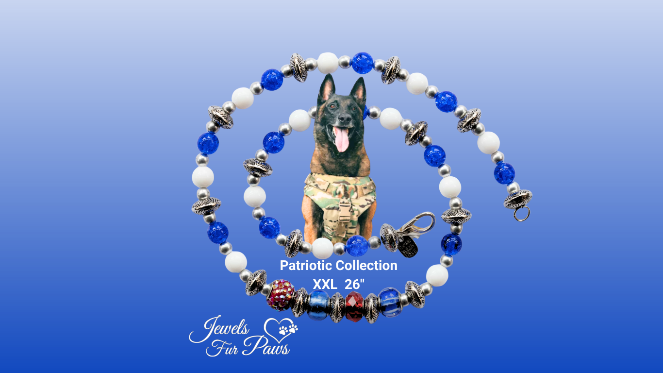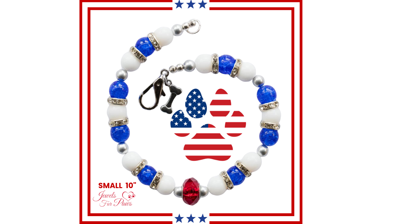 handcrafted Patriotic Pet Necklace Collection, made in the USA and designed to shine for holidays, photoshoots, parades, and everyday flair.