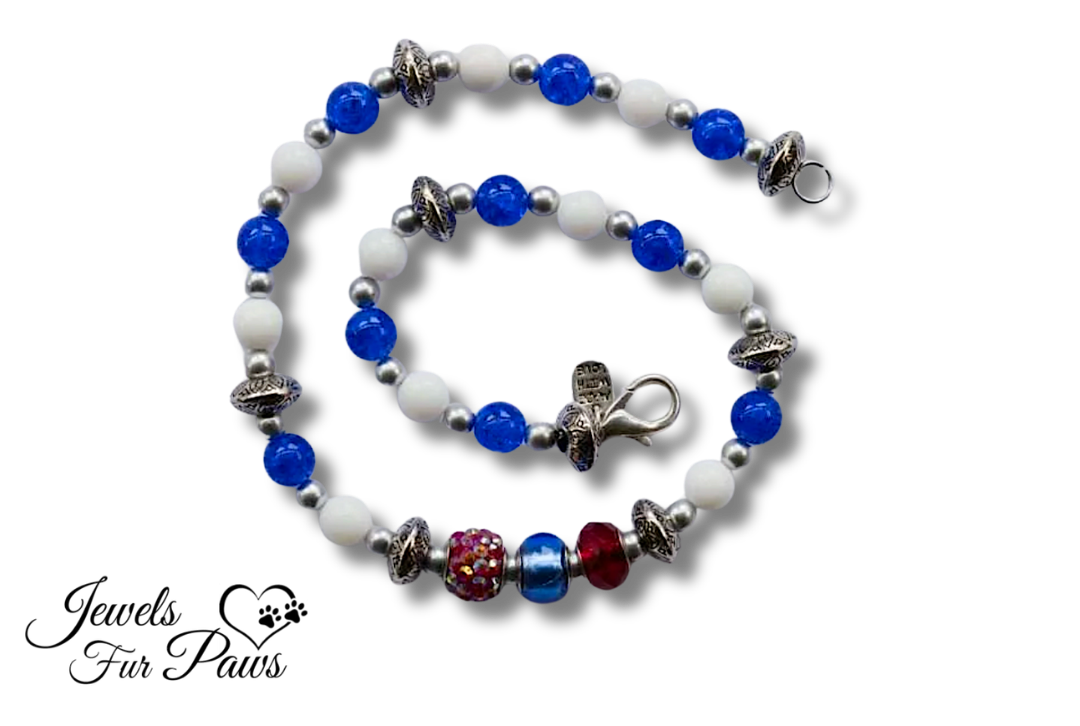 Handmade patriotic red, white, and blue dog and cat necklace featuring a red crystal bead, blue crystals, and white beads—USA-made pet jewelry for holidays, photoshoots, and everyday style.