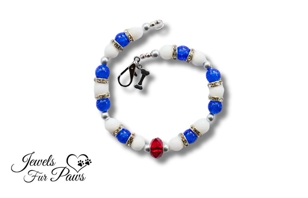 🎀 Unique red, white & blue artisan designs 🧵 Durable Accu-Flex wire core (300 lb.) Handmade in the USA 🐾 Comfortable for small to XL pets 📸 Photo-ready sparkle