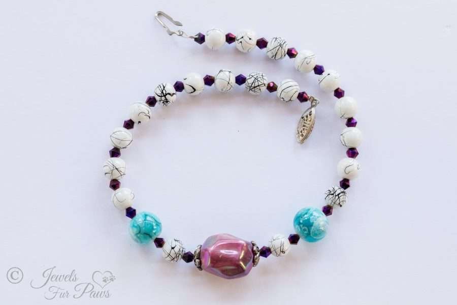 This handcrafted necklace is perfect for your fashionable furry friends. It is strung with white marbleized beads and purple crystals, and features a stunning magenta acrylic.