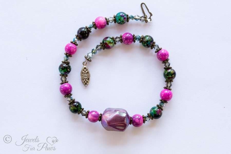 This handcrafted necklace is perfect for your fashionable furry friends. It is strung with an irregularly shaped fuchsia bauble bead and green marble beads with purple "pearl" beads.