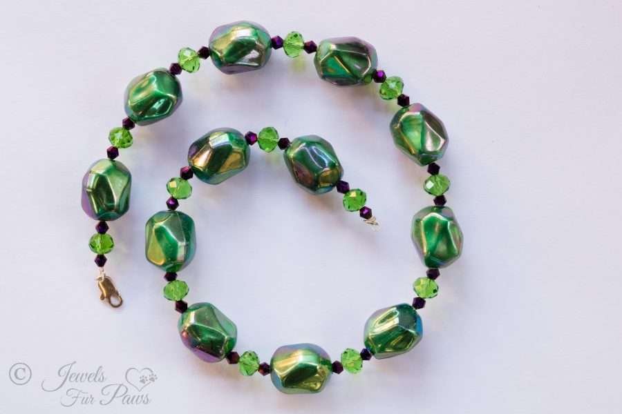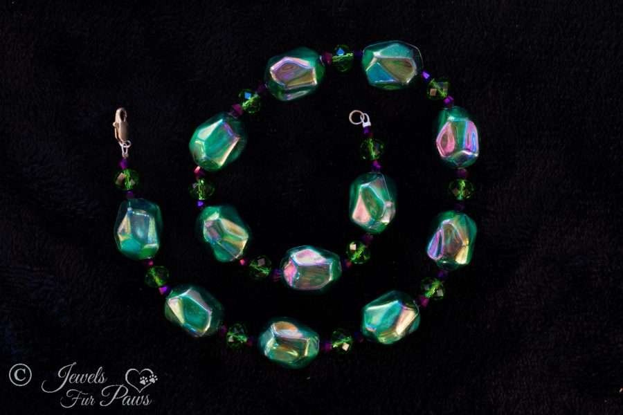 This handcrafted necklace is perfect for your fashionable furry friends. It is strung with stunning emerald green bauble beads complemented by green Swarovski crystal spacers.