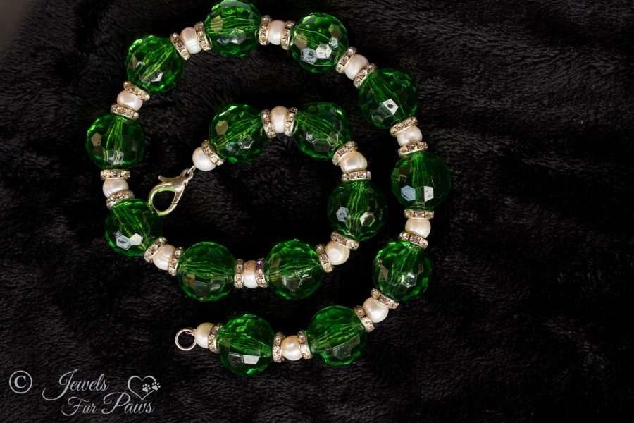 This handcrafted necklace is strung with transparent green acrylic beads complemented by small cultured pearls. This piece is finished with Swarovski crystal silver rondels for your fetching furry friend or family member.