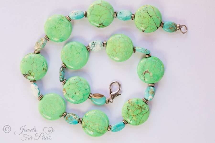 This handcrafted necklace features stunning flat green turquoise stones. The alternating sizes of small and large flat turquoise are completed with complementary silver spacers.