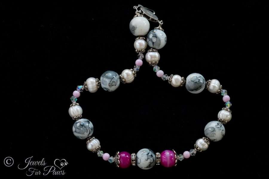 This handcrafted necklace features stunning gray marbleized beads strung with cultured pearls and are complemented by fuchsia accent beads, while clear crystals and silver spacers complete this beautiful piece.