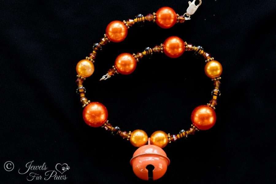This is our handcrafted, beaded necklace featuring an orange hanging bell for your fetching furry friend. It is strung with beautiful orange pearl beads and amber tigers eye crystals.