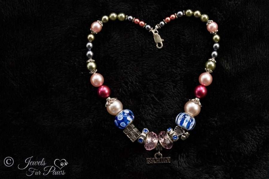 This purrty handcrafted necklace is strung with stunning blue lamp glass. Large faceted pink Czech crystals embrace a hanging "Family" pendant charm. Pink pearl beads complemented by smaller olive beads complete this piece for your furry family member.