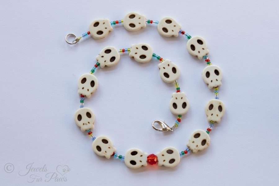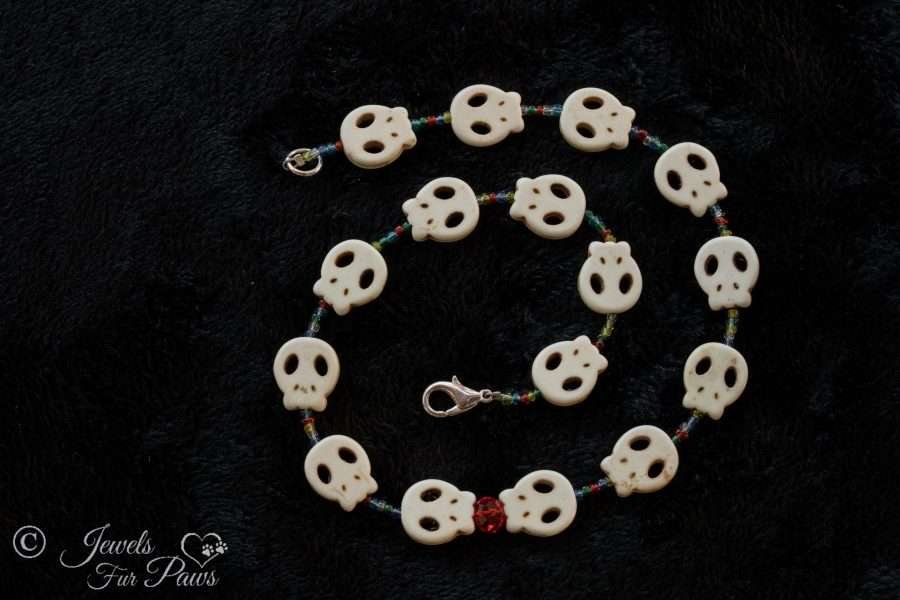 This spooky handcrafted necklace is strung with off-white skull beads feature a large red Czech crystal, and small multicolored crystal spacer gems.