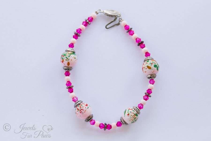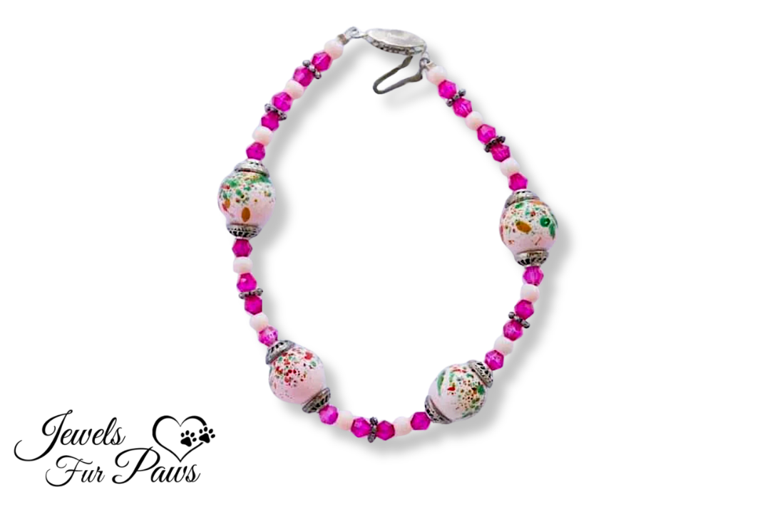This is our handcrafted beaded necklace featuring large, powder pink speckled beads. It is strung with complementary fuchsia crystals. Don't pro-cat-inate on this amazing deal.