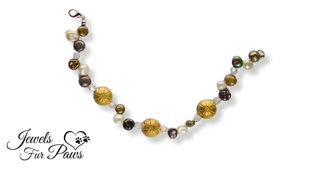 Three antique gold plated round beads with cultured with freshwater pearls and red carnelian are featured on this pet necklace that can fit your smaller dog breeds as well as the fur baby's Mommy as a bracelet.