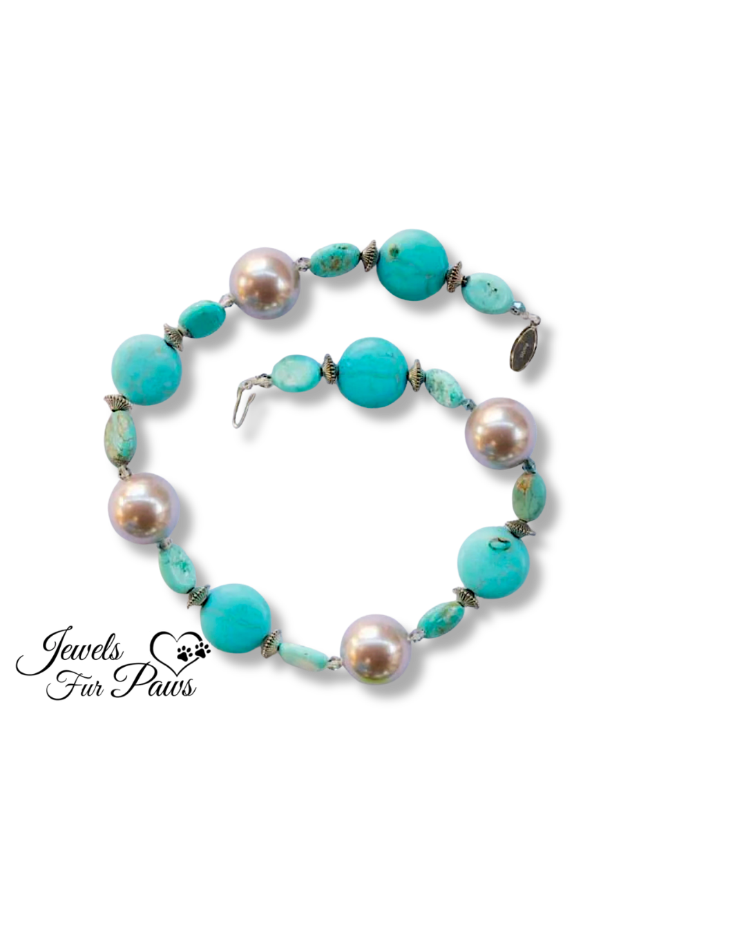 This handcrafted necklace features stunning turquoise stones in various sizes. Complementary iridescent silver pearl beads as well as silver spaces complete this beautiful piece.