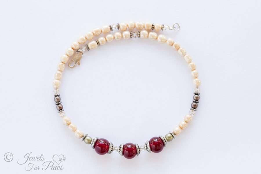 Amaze your furry friends with these stunning antique Japanese red cherry stones. This handcrafted necklace is strung with vintage beads, vintage cultured pearls and silver accents.