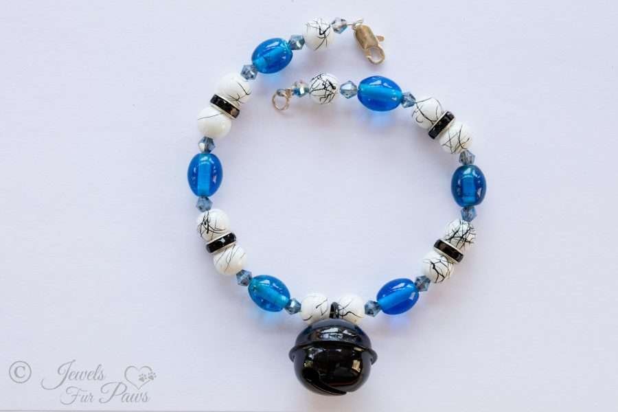 This is our handcrafted, beaded necklace featuring a black hanging bell for your fetching furry friend. It is strung with white and black marbleized beads and beautiful blue oval Czech crystal beads.