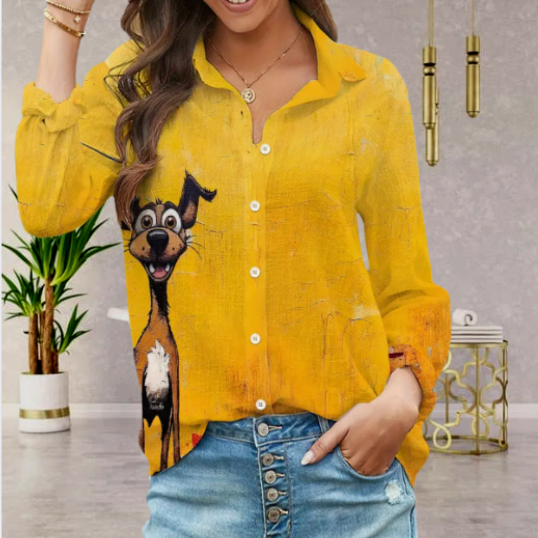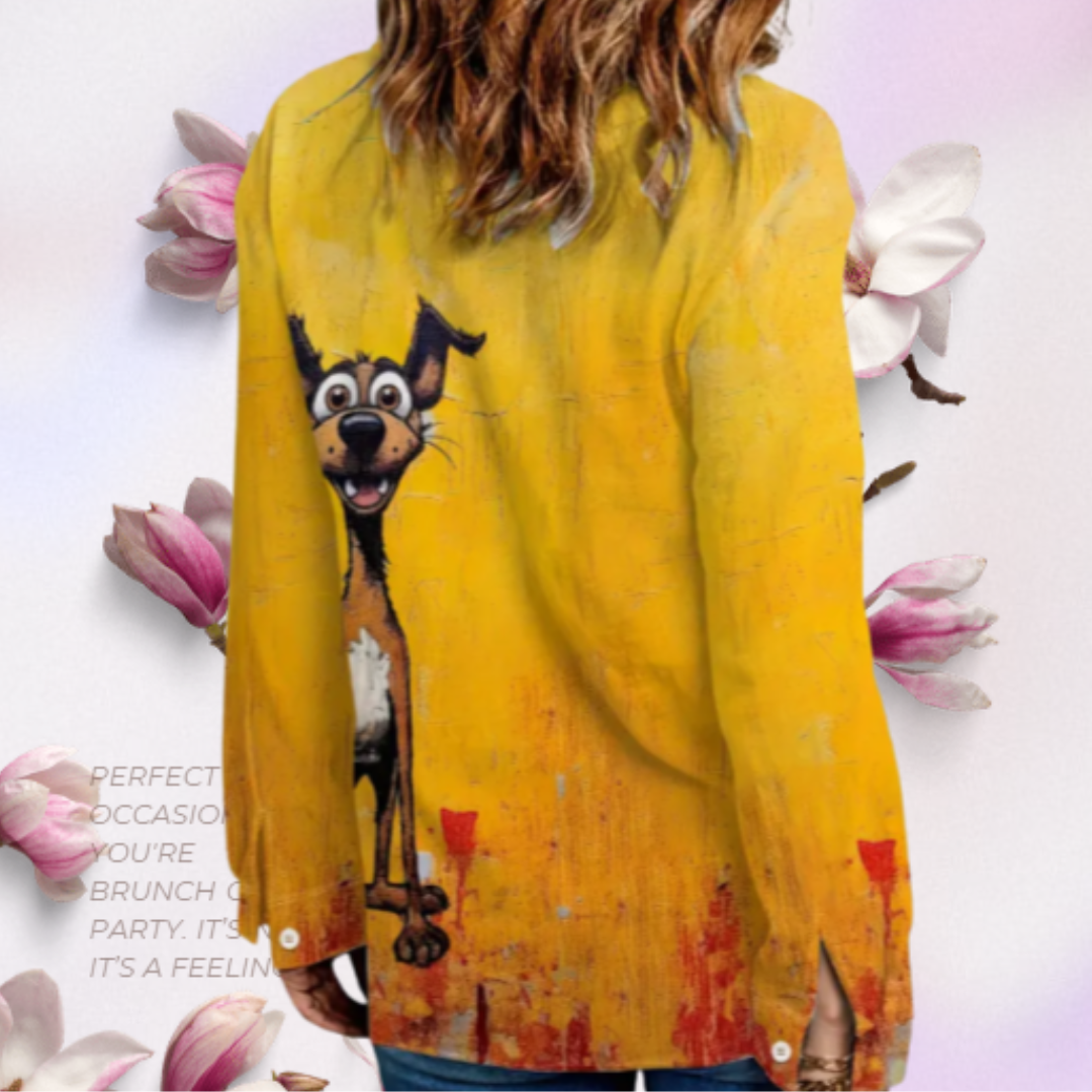 This women’s long-sleeve button-up features a fun 3D dog print with a sunny yellow gradient for an effortlessly playful look. Made from lightweight, slightly stretchy polyester, it’s comfy, flattering, and easy to wear all day.