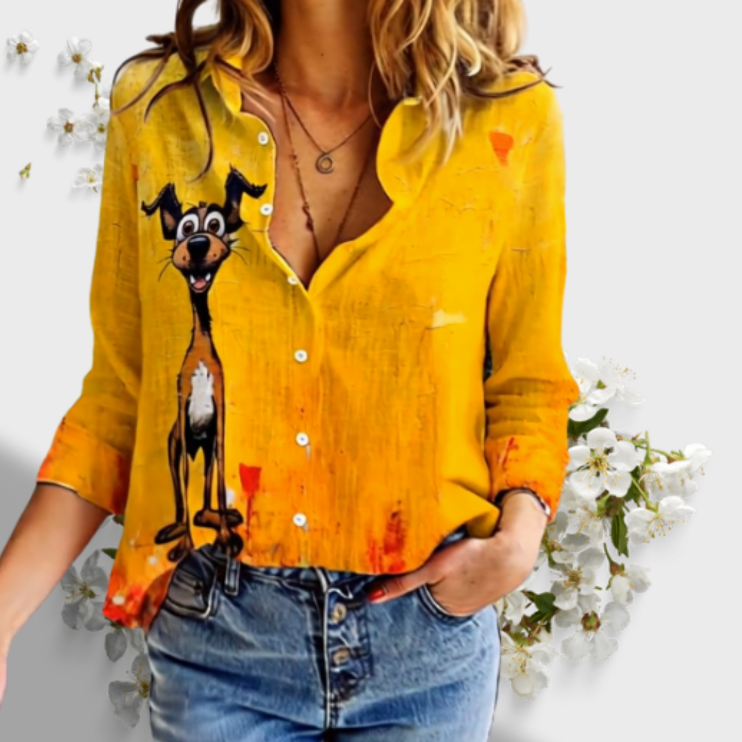 Perfect for spring or fall, this eye-catching blouse pairs beautifully with jeans, skirts, or leggings and is ideal for coffee dates, casual outings, or walks with your furry friend!