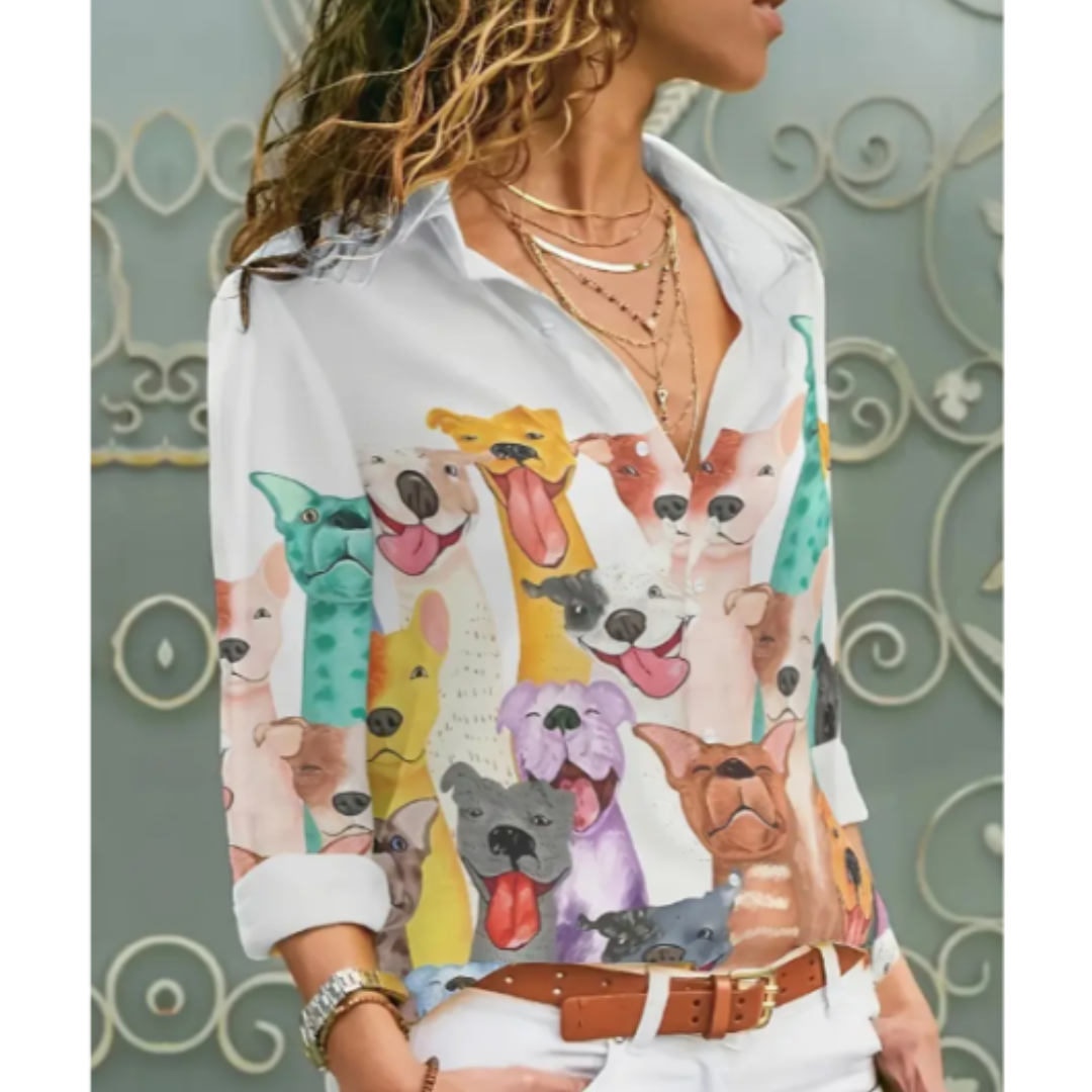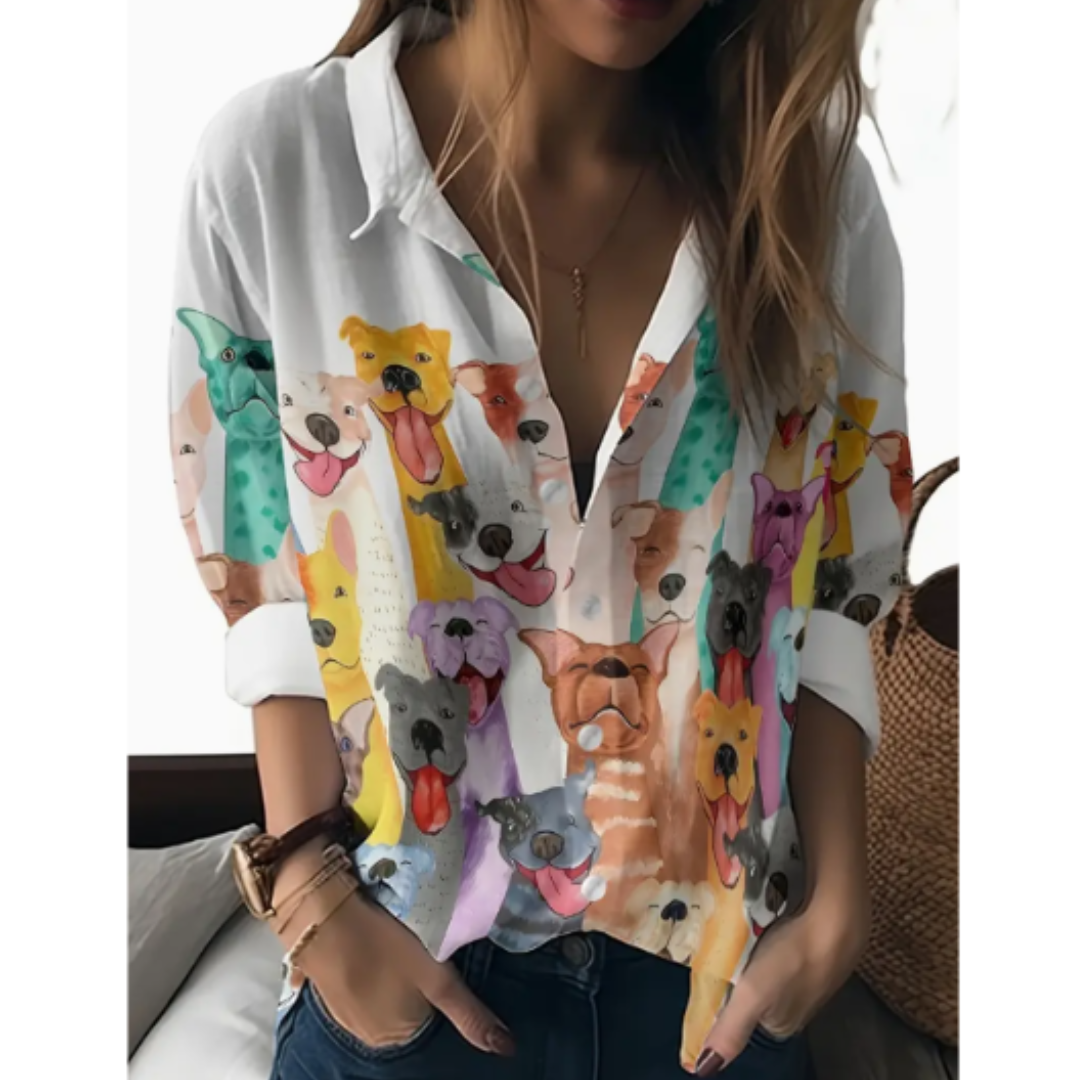 Women’s Colorful Dog Print Button Up Shirt, Casual Long Sleeve Blouse with Collar, Machine Washable Polyester Top, Cute Pet Lover Gift