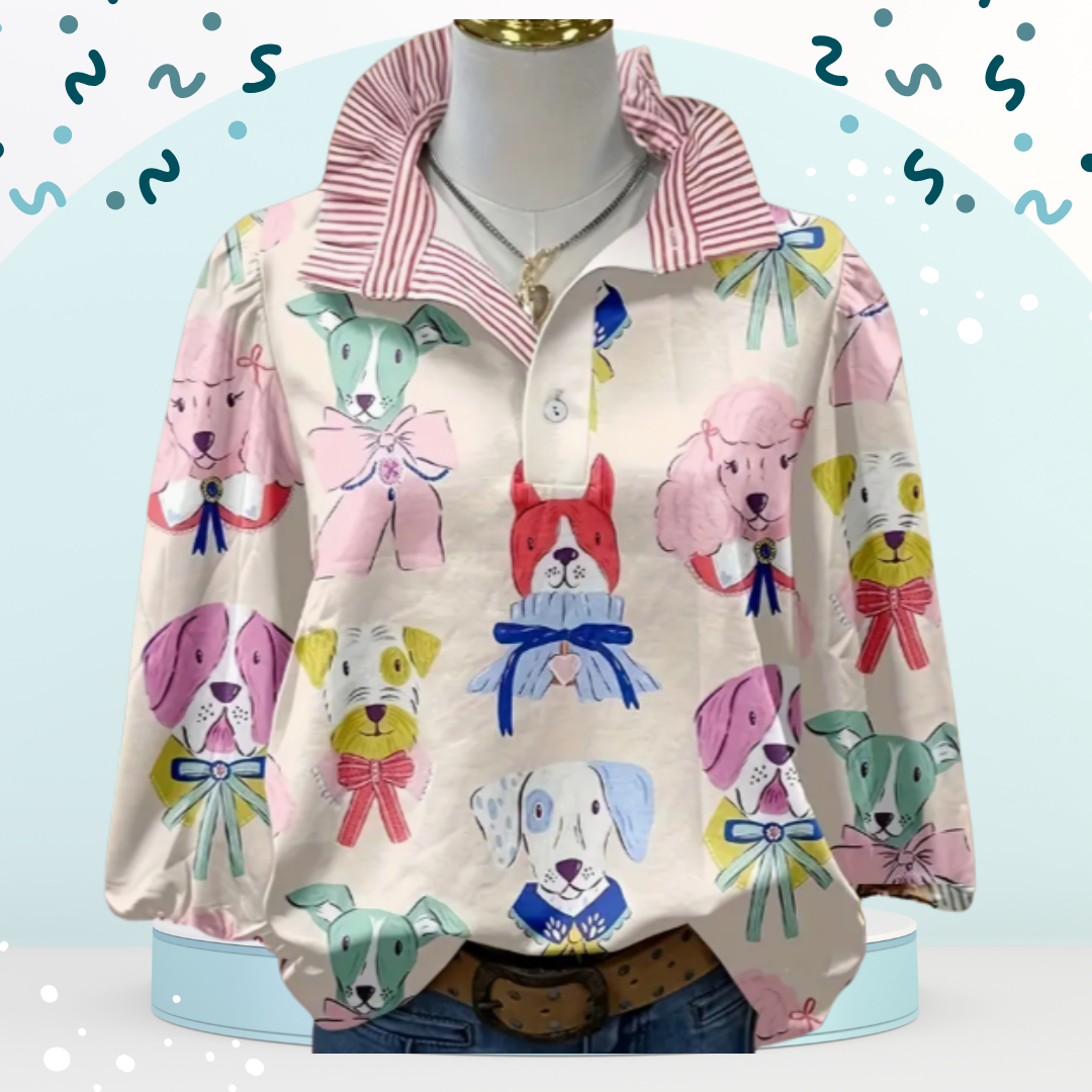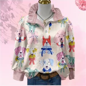 Cute and comfy, this women’s dog print blouse features a V-neck striped collar, long sleeves, and a relaxed fit, perfect for casual fall and winter days.